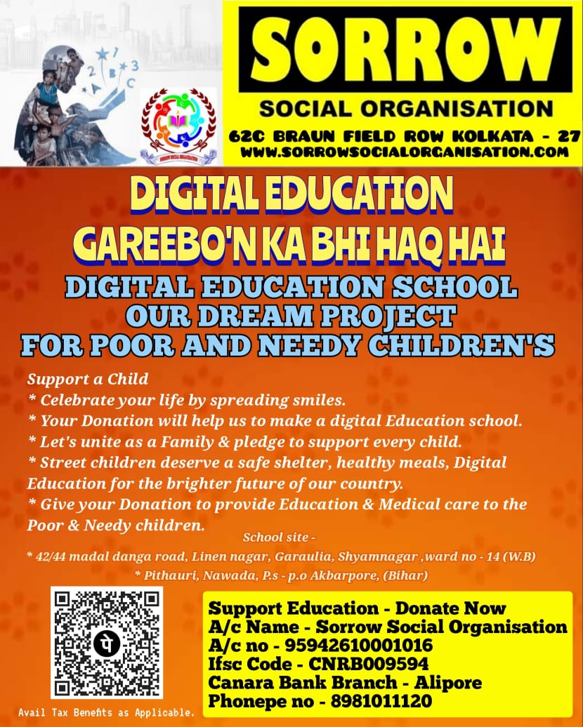 The mission is huge. Step by step people at Sorrow Social Organisation aim to achieve it. With your support and government aid we can create a better environment. Over 15 years we have accomplished a number of a projects for the social good. We are now massively focussing on education. Hence, we request all of you to come forward and donate…. Read More